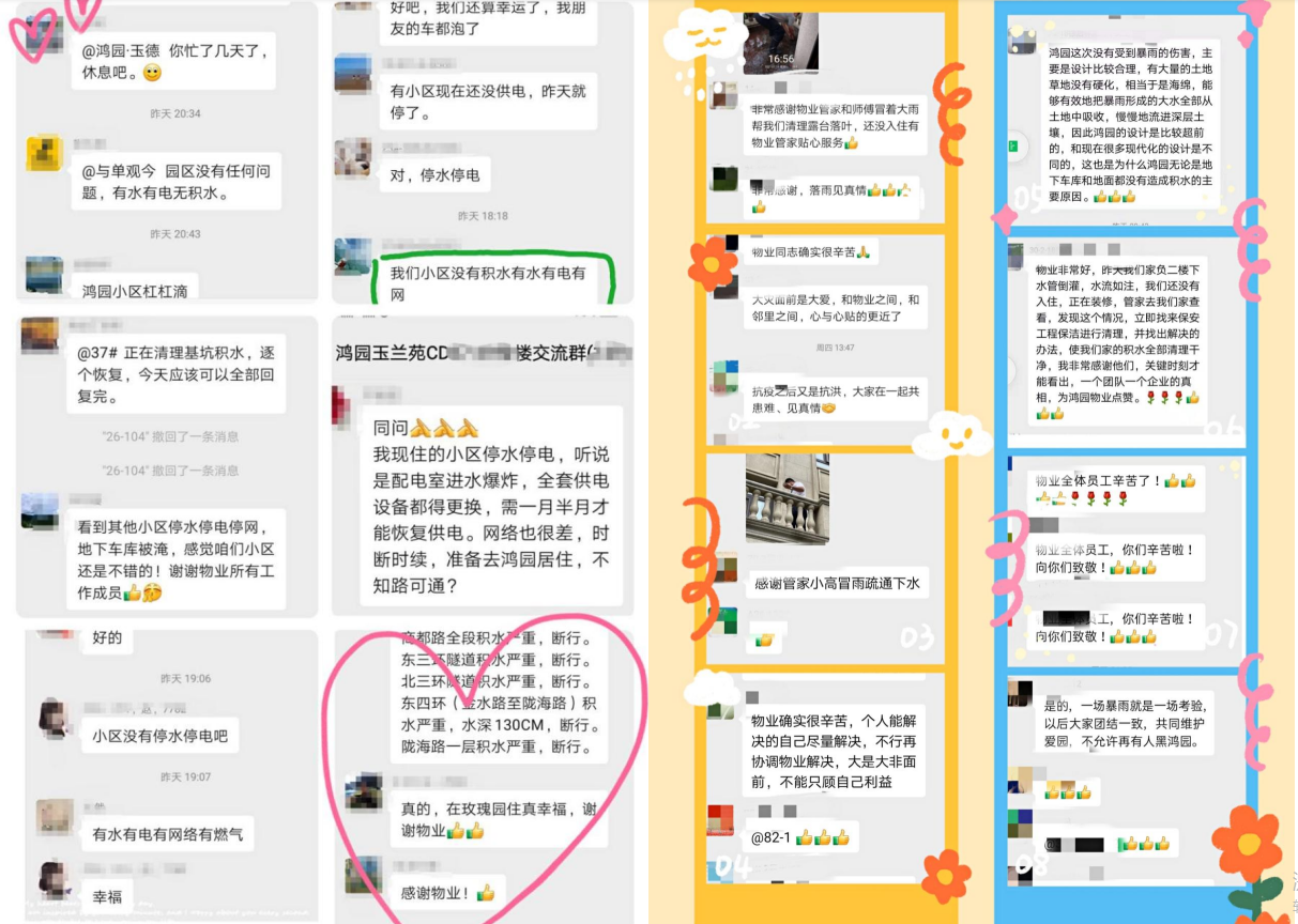 在本次汛情中,鴻寶所屬項(xiàng)目地庫(kù)無(wú)一被淹,園區(qū)地面無(wú)一積水,園區(qū)水電氣網(wǎng)基本從未停斷,并積極推進(jìn)訊后救援修復(fù)工作,贏得了轄區(qū)居民的一致點(diǎn)贊和好評(píng)。