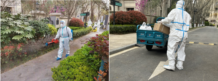 次日一早,鴻寶物業(yè)組織抗疫動員會,正式吹響抗疫集結(jié)號。因小區(qū)全封閉管理,項目人員全部轉(zhuǎn)移至外圍工作。但小區(qū)內(nèi)57戶200余名業(yè)主的日常生活需求同樣不容忽視,為確保疫情防控和物業(yè)服務(wù)兩不誤,來自基層崗位四個部門的六名員工常永安、蔡小銀、楊志、李志建、牛鑫杰、高坤響應(yīng)號召,在傳播鏈條不清晰、防控趨勢不明朗的嚴(yán)峻形勢下,主動請纓擔(dān)任抗疫志愿者,清晨06:30便集合到位,以大無畏精神毅然決然地深入封控小區(qū)最前線,化身全副武裝的“大白”,實時響應(yīng)業(yè)主需求,執(zhí)行物資配送、環(huán)境消殺、垃圾轉(zhuǎn)運(yùn)、工程維修等各項任務(wù)。面對超出常規(guī)的工作量和前所未有的抗疫壓力,他們竭盡全力,不辭辛苦。楊志、李志建是專門負(fù)責(zé)物資配送的“大白”,每日一趟趟往返奔波在小區(qū)門崗與各家各戶之間,僅3月30日一天便為業(yè)主配送生活用品、快遞多達(dá)133件。